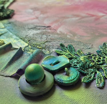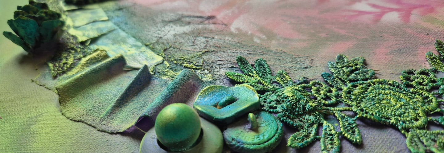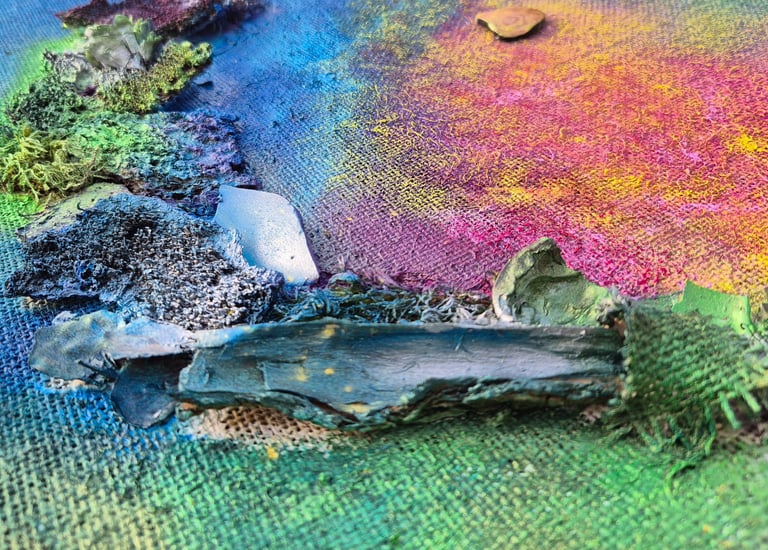 J'utilise des matériaux issus du recyclage comme les moments de vie que je viens sublimer par les couleurs profondes, intenses, et vives tel un pansement sur les maux. L'approche est à la fois artistique et éco-responsable.