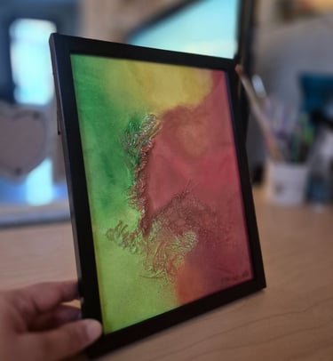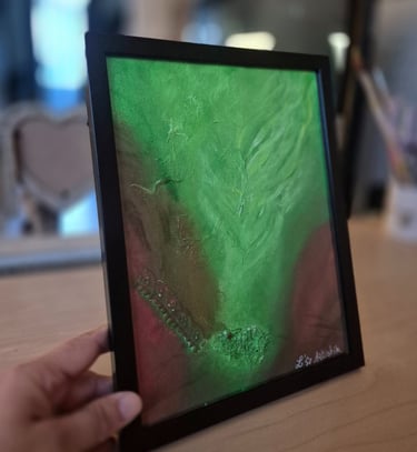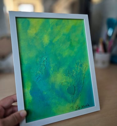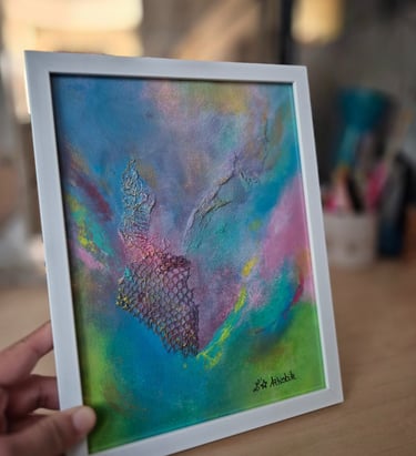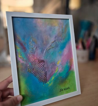 Œuvres 18x24 cm mêlant matière recyclée et acrylique, idéales à poser ou accrocher